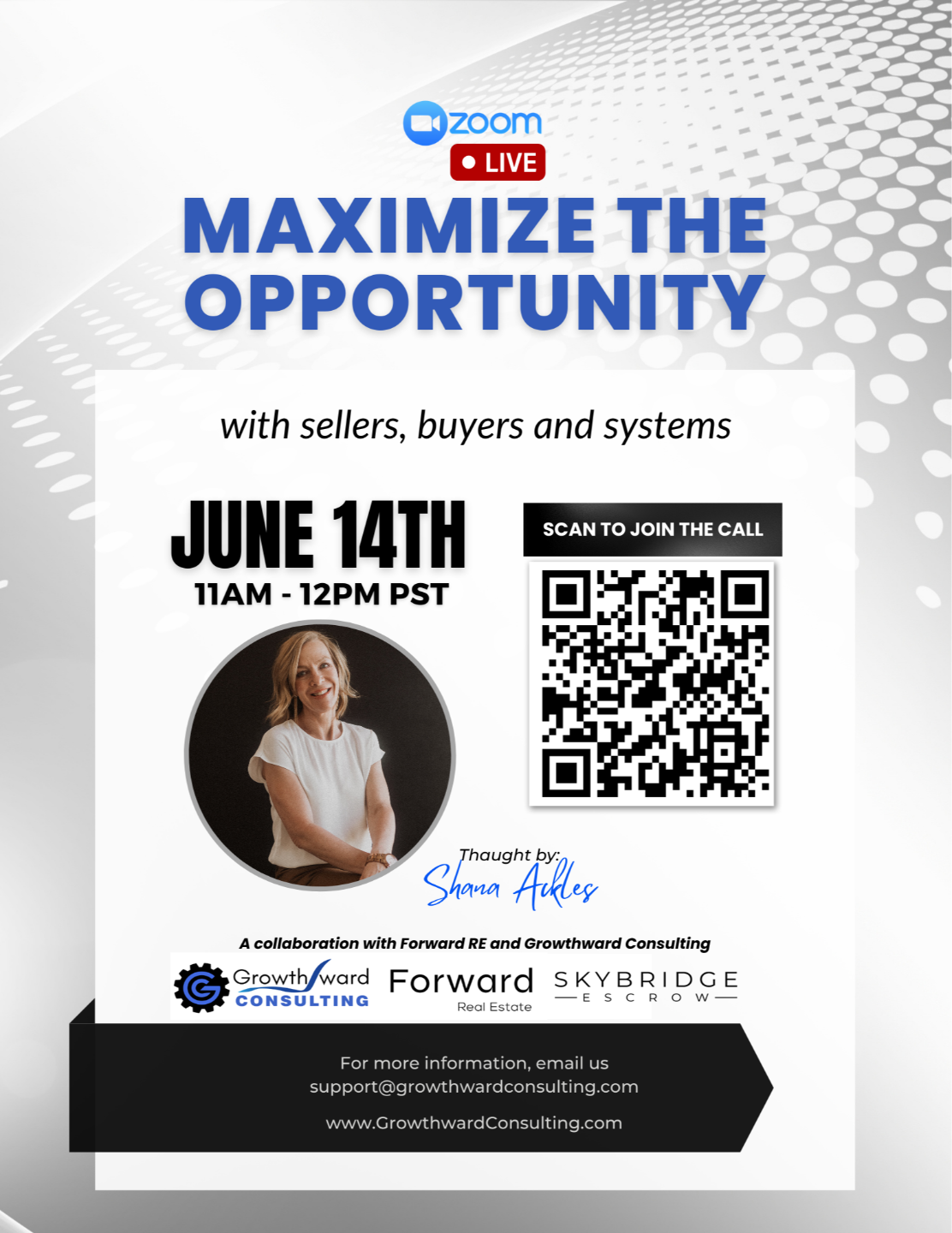 Join Shana Ackles, VP of Growthward Consulting for an Exclusive live event "Maximize the Opportunity" on Wed, June 14th at 11AM - 12PM PT.